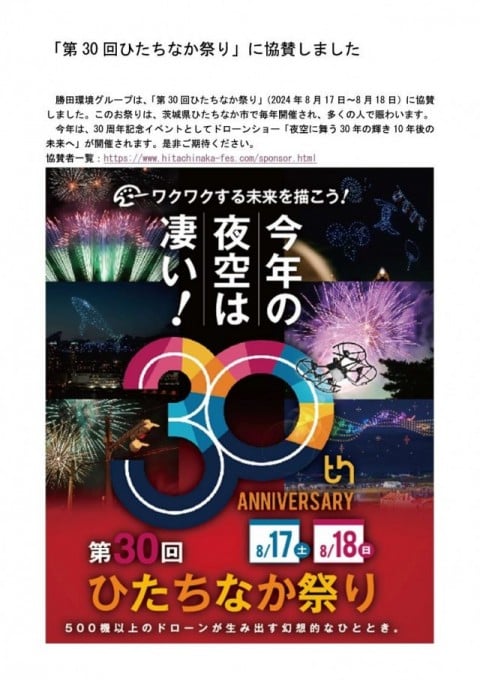 勝田環境グループは、「第 30 回ひたちなか祭り」(2024 年 8 月 17 日~8 月 18 日)に協賛