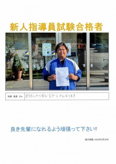イベントニュース新人指導員 イベントニュース新人指導員 新人指導員 2025年9月22日 2025年9月22日(月)に新入社員を指導する新人指導員試験の合格発表が行われ、試験者全員(1名)が合格しました。新人指導員には今後1年間、新人指導員手当として毎月3,000円が支給されます。 関連カテゴリー 磯崎自治会主催 「心と体の健康増進Fes.」 イベントニュース 2025年10月5日 スカニア(外車トラック)購入について イベントニュース 2025年8月20日 BBQ イベントニュース 2025年8月8日 還暦(定年)祝い イベントニュース 2025年7月18日 その他の記事 磯崎自治会主催 「心と体の健康増進Fes.」 スカニア(外車トラック)購入について BBQ 還暦(定年)祝い 茨城県貯水槽維持管理協会会長表彰 もっとロードする