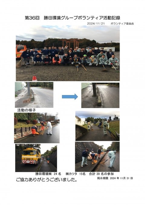 イベントニュース第36回勝田環境グループボランティア清掃 イベントニュース第36回勝田環境グループボランティア清掃 第36回勝田環境グループボランティア清掃 2024年11月21日 2024年11月21日(木)の早朝に勝田環境の社員24名、グループ会社の社員15名、合計39名で勝田環境RC事業所周辺の道路と高野墓地の清掃を行いました。 関連カテゴリー 磯崎自治会主催 「心と体の健康増進Fes.」 イベントニュース 2025年10月5日 新人指導員 イベントニュース 2025年9月22日 スカニア(外車トラック)購入について イベントニュース 2025年8月20日 BBQ イベントニュース 2025年8月8日 その他の記事 磯崎自治会主催 「心と体の健康増進Fes.」 新人指導員 スカニア(外車トラック)購入について BBQ 還暦(定年)祝い もっとロードする
