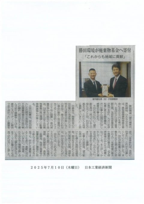 掲載メディア2025.07.10 日本工業新聞 掲載メディア2025.07.10 日本工業新聞 2025.07.10 日本工業新聞 2025年7月10日 2025年7月10日の日本工業新聞にて勝田環境の県有害廃棄物等撤去基金に寄付を行った記事が掲載されました。 関連カテゴリー 2025.07.05 茨城新聞 掲載メディア 2025年7月5日 2024.06.04 茨城新聞 掲載メディア 2024年6月4日 2023.06.25 ひたちなか市市報 掲載メディア 2023年6月25日 2021.11.08 週刊循環経済新聞 掲載メディア 2021年11月8日 その他の記事 2025.07.05 茨城新聞 2024.06.04 茨城新聞 2023.06.25 ひたちなか市市報 2021.11.08 週刊循環経済新聞 2021.06.01 常陽産研NEWS もっとロードする